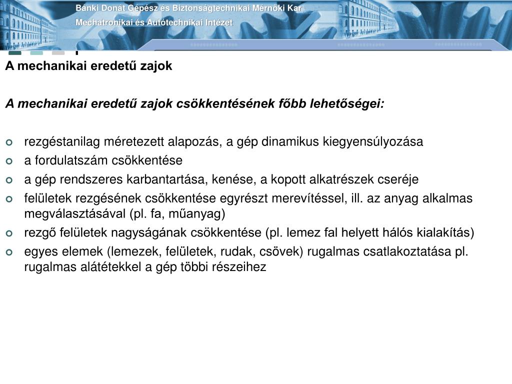 Bánki Donát Gépész és Biztonságtechnikai Mérnöki KarMechatronikai és Autótechnikai Intézet A mechanikai eredetű zajok A mechanikai eredetű zajok csökkentésének főbb lehetőségei: • rezgéstanilag méretezett alapozás, a gép dinamikus kiegyensúlyozása • a fordulatszám csökkentése • a gép rendszeres karbantartása, kenése, a kopott alkatrészek cseréje • felületek rezgésének csökkentése egyrészt merevítéssel, ill. az anyag alkalmas megválasztásával (pl. fa, műanyag) • rezgő felületek nagyságának csökkentése (pl. lemez fal helyett hálós kialakítás) • egyes elemek (lemezek, felületek, rudak, csövek) rugalmas csatlakoztatása pl. rugalmas alátétekkel a gép többi részeihez