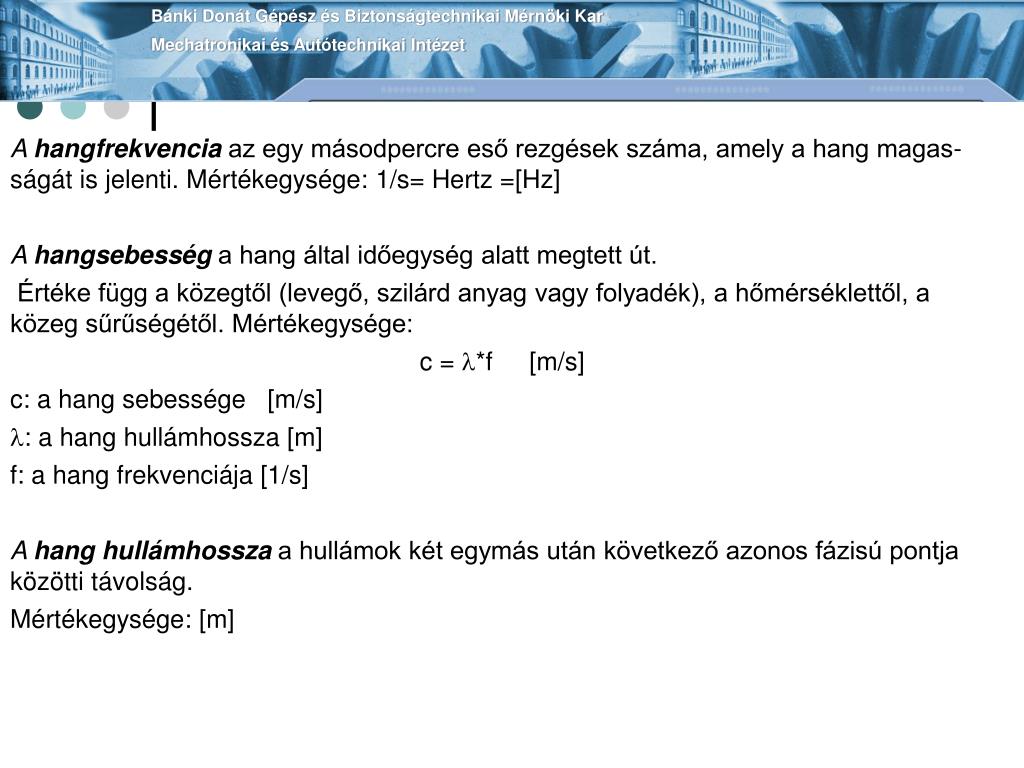 Bánki Donát Gépész és Biztonságtechnikai Mérnöki KarMechatronikai és Autótechnikai Intézet A hangfrekvencia az egy másodpercre eső rezgések száma, amely a hang magasságát is jelenti. Mértékegysége: 1/s= Hertz =[Hz] A hangsebességa hang által időegység alatt megtett út. Értéke függ a közegtől (levegő, szilárd anyag vagy folyadék), a hőmérséklettől, a közeg sűrűségétől. Mértékegysége: c = *f [m/s] c: a hang sebessége [m/s] : a hang hullámhossza [m] f: a hang frekvenciája [1/s] A hang hullámhossza a hullámok két egymás után következő azonos fázisú pontja közötti távolság. Mértékegysége: [m]