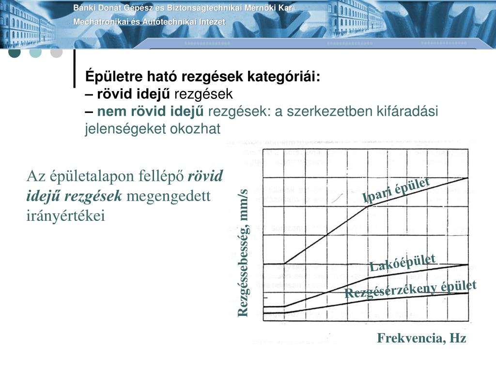 Épületre ható rezgések kategóriái:– rövid idejű rezgések–nem rövid idejű rezgések: a szerkezetben kifáradási jelenségeket okozhat Bánki Donát Gépész és Biztonságtechnikai Mérnöki KarMechatronikai és Autótechnikai Intézet Ipari épület Rezgéssebesség, mm/s Lakóépület Rezgésérzékeny épület Frekvencia, Hz Az épületalapon fellépő rövid idejű rezgések megengedett irányértékei