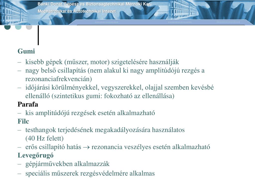 Bánki Donát Gépész és Biztonságtechnikai Mérnöki KarMechatronikai és Autótechnikai Intézet Gumi • kisebb gépek (műszer, motor) szigetelésére használják • nagy belső csillapítás (nem alakul ki nagy amplitúdójú rezgés a rezonanciafrekvencián) • időjárási körülményekkel, vegyszerekkel, olajjal szemben kevésbé ellenálló (szintetikus gumi: fokozható az ellenállása) Parafa • kis amplitúdójú rezgések esetén alkalmazható Filc • testhangok terjedésének megakadályozására használatos (40 Hz felett) • erős csillapító hatás rezonancia veszélyes esetén alkalmazható Levegőrugó • gépjárművekben alkalmazzák • speciális műszerek rezgésvédelmére alkalmas