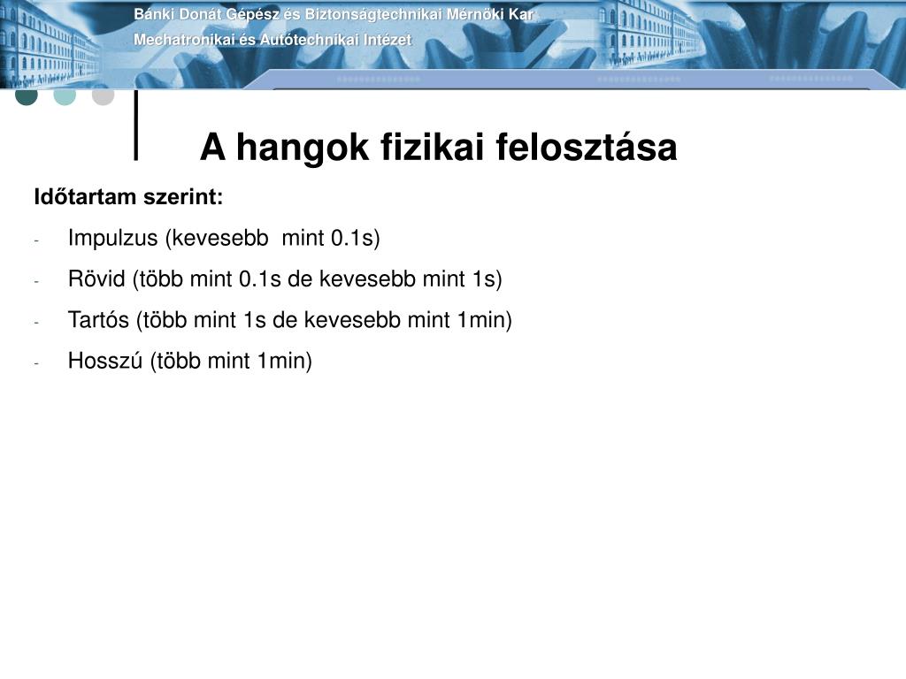 Bánki Donát Gépész és Biztonságtechnikai Mérnöki KarMechatronikai és Autótechnikai Intézet A hangok fizikai felosztása Időtartam szerint: • Impulzus (kevesebb mint 0.1s) • Rövid (több mint 0.1s de kevesebb mint 1s) • Tartós (több mint 1s de kevesebb mint 1min) • Hosszú (több mint 1min)