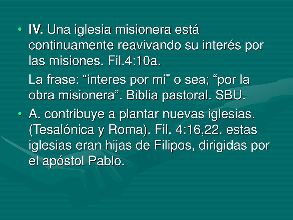 IV. Una iglesia misionera está continuamente reavivando su interés por las misiones. Fil.4:10a. La frase: “interes por mi” o sea; “por la obra misionera”. Biblia pastoral. SBU. • A. contribuye a plantar nuevas iglesias. (Tesalónica y Roma). Fil. 4:16,22. estas iglesias eran hijas de Filipos, dirigidas por el apóstol Pablo.
