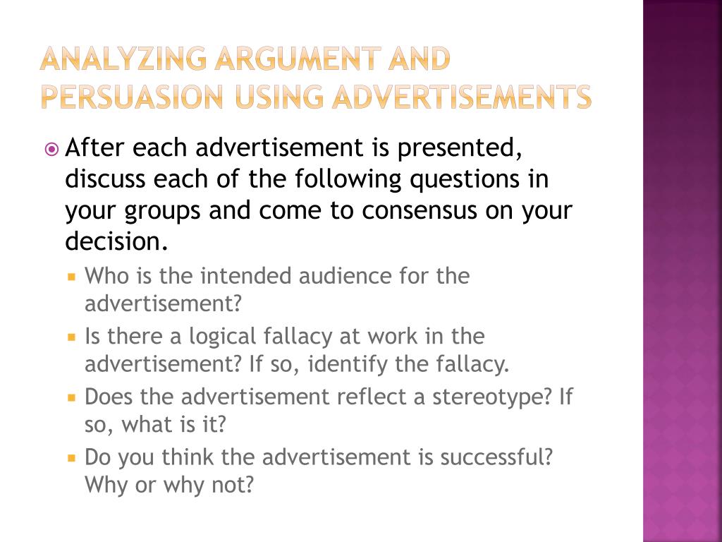 Analyzing Argument and Persuasion using Advertisements • After each advertisement is presented, discuss each of the following questions in your groups and come to consensus on your decision. • Who is the intended audience for the advertisement? • Is there a logical fallacy at work in the advertisement? If so, identify the fallacy. • Does the advertisement reflect a stereotype? If so, what is it? • Do you think the advertisement is successful? Why or why not?