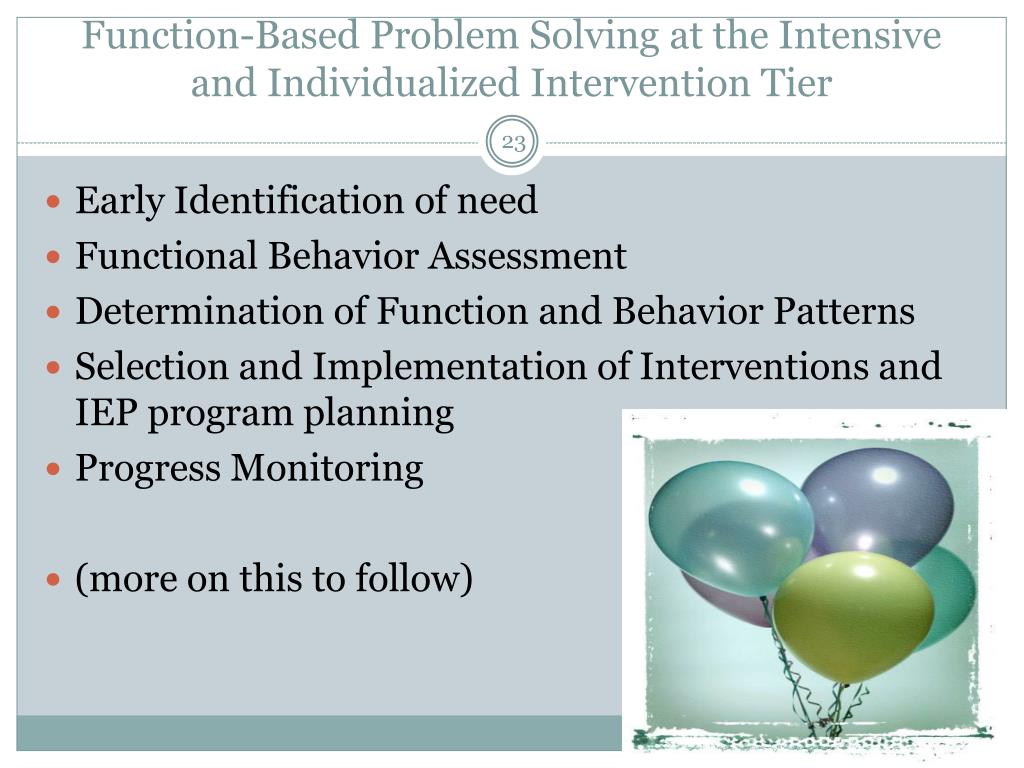 Function-Based Problem Solving at the Intensive and Individualized Intervention Tier Early Identification of need Functional Behavior Assessment Determination of Function and Behavior Patterns Selection and Implementation of Interventions and IEP program planning Progress Monitoring (more on this to follow)