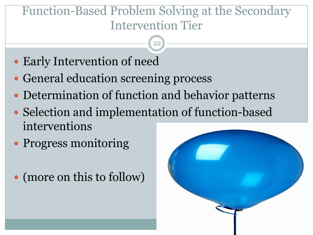 Function-Based Problem Solving at the Secondary Intervention Tier Early Intervention of need General education screening process Determination of function and behavior patterns Selection and implementation of function-based interventions Progress monitoring (more on this to follow)