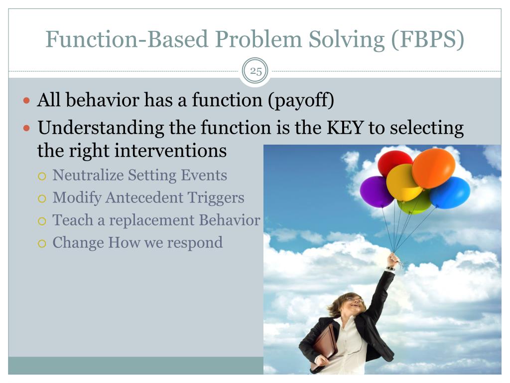 Function-Based Problem Solving (FBPS) • All behavior has a function (payoff) • Understanding the function is the KEY to selecting the right interventions • Neutralize Setting Events • Modify Antecedent Triggers • Teach a replacement Behavior • Change How we respond