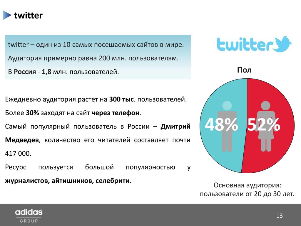 twitter twitter – одиниз 10 самых посещаемых сайтов в мире. Аудитория примерно равна 200 млн. пользователям. ВРоссия-1,8млн.пользователей. Пол 48%52% Основнаяаудитория: пользователиот20до30лет. Ежедневноаудиториярастетна300тыс. пользователей. Более30%заходят на сайтчерезтелефон. Самыйпопулярныйпользователь вРоссии–ДмитрийМедведев,количествоегочитателейсоставляет почти417000. Ресурспользуетсябольшойпопулярностьюужурналистов,айтишников,селебрити.