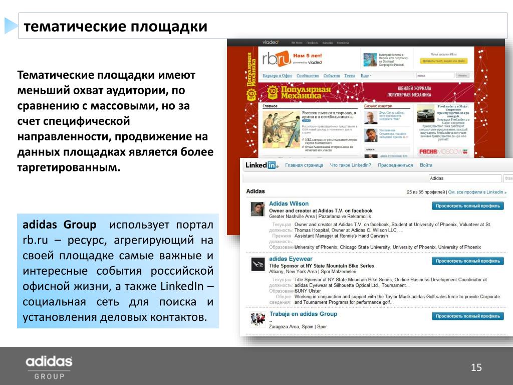 тематические площадки Тематические площадки имеют меньший охват аудитории, по сравнению с массовыми, но за счет специфической направленности, продвижение на данных площадках является более таргетированным. adidas Group использует портал rb.ru – ресурс, агрегирующий на своей площадке самые важные и интересные события российской офисной жизни, а также LinkedIn – социальная сеть для поиска и установления деловых контактов.