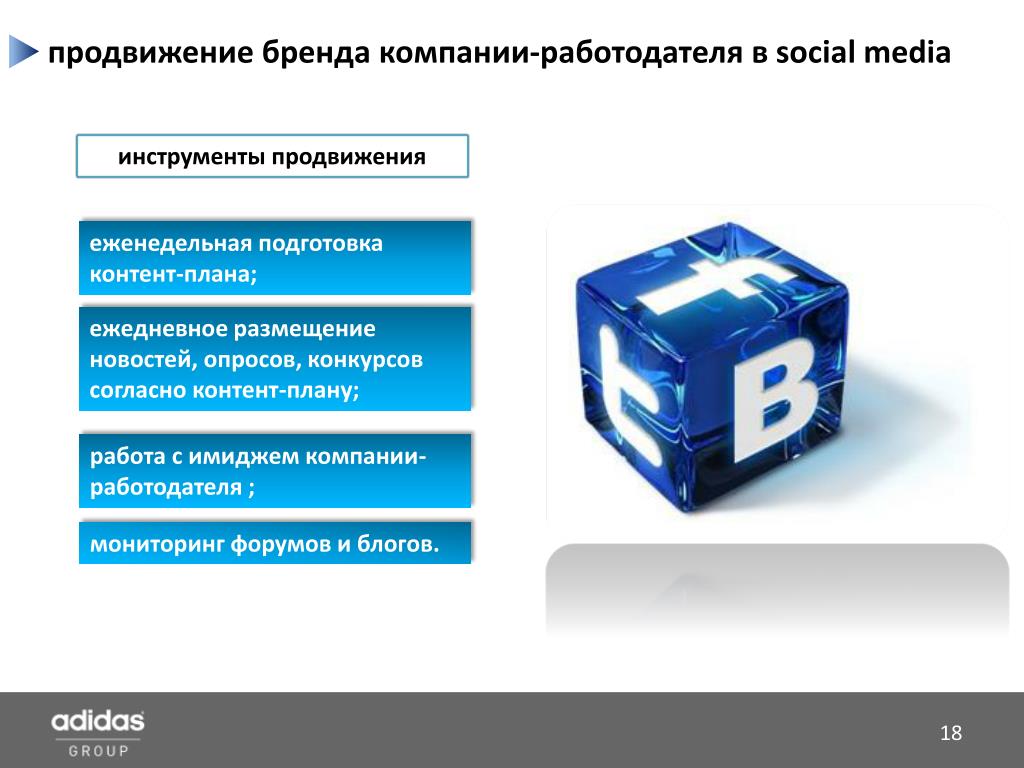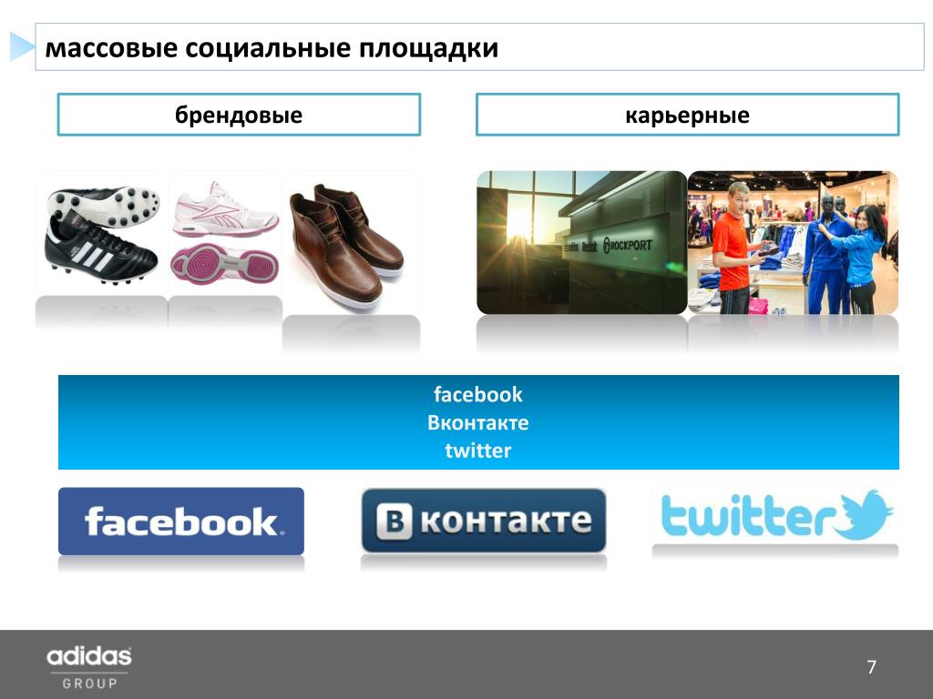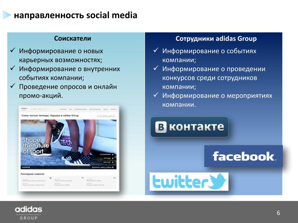 направленность social media Соискатели Сотрудники adidas Group • Информирование о новых карьерных возможностях; • Информирование о внутренних событиях компании; • Проведение опросов и онлайн промо-акций. • Информирование о событиях компании; • Информирование о проведении конкурсов среди сотрудников компании; • Информирование о мероприятиях компании.