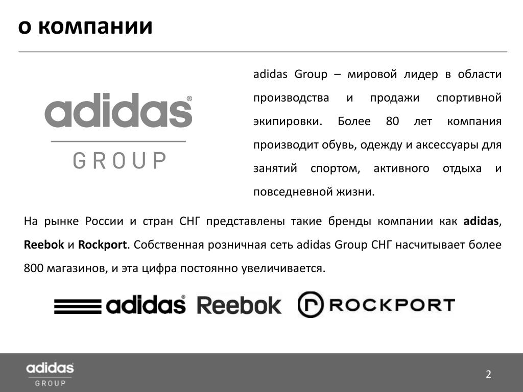 о компании adidas Group – мировой лидер в области производства и продажи спортивной экипировки. Более 80 лет компания производит обувь, одежду и аксессуары для занятий спортом, активного отдыха и повседневной жизни. На рынке России и стран СНГ представлены такие бренды компании как adidas, Reebok и Rockport. Собственная розничная сеть adidas Group СНГ насчитывает более 800 магазинов, и эта цифра постоянно увеличивается.
