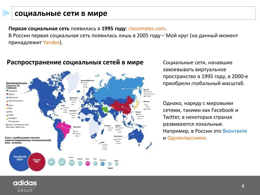 социальные сети в мире Перваясоциальнаясетьпоявилась в 1995 году: classmates.com. В России первая социальная сеть появилась лишь в 2005 году – Мойкруг (на данный момент принадлежит Yandex). Распространение социальных сетей в мире Социальные сети, начавшие завоевывать виртуальное пространство в 1995 году, в 2000-е приобрели глобальный масштаб. Великобритания Facebook Twitter LinkedIn Доминирующие соцсетипо странам Facebook QZone ВКонтакте Одноклассники Россия ВКонтакте Одноклассники Facebook Япония Германия Facebook Twitter Xing Однако, наряду с мировыми сетями, такими как Facebook и Twitter, в некоторых странах развиваются локальные. Например, в России это Вконтакте и Одноклассники. Mixi Twitter Facebook Orkut Mixi Zing Cloob Draughen Нет данных Данные на февраль 2011 Источник: Alexa.com США Facebook Twitter LinkedIn Испания Facebook Twitter Tuenti Бразилия Orkut Facebook Twitter Китай QZone Sina Weibo Renren Египет Facebook Twitter ЮАР Facebook Twitter LinkedIn Индия Facebook Orkut Twitter Австралия Facebook Twitter LinkedIn Сети с наибольшим числом зарегистрированных пользователей, млн. человек Facebook 640+ Renren 160 MySpace 125+ Orkut 120+ Bebo 117 Qzone 480 Habbo Twitter ВКонтакте 110+ Badoo 100+ 200 200 100+ Tagged