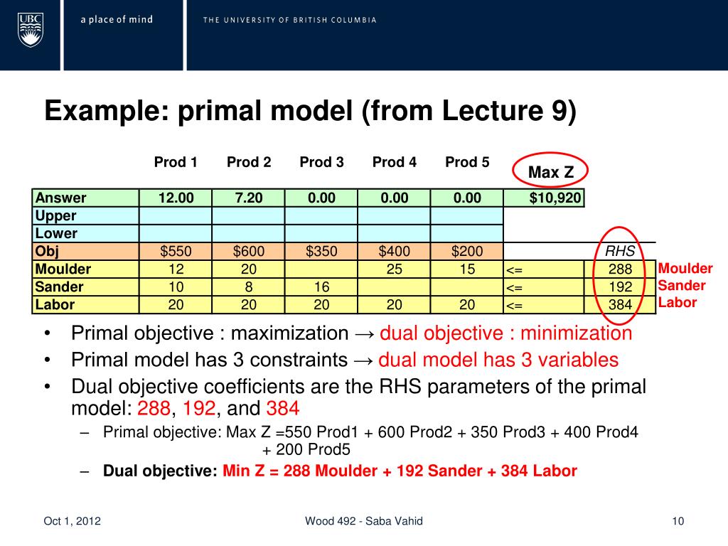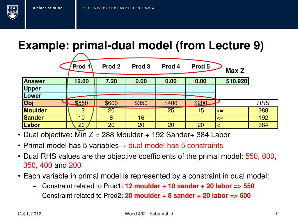 Example: primal-dual model (from Lecture 9) • Dual objective:Min Z = 288 Moulder + 192 Sander+ 384 Labor • Primal model has 5 variables→ dual model has 5 constraints • Dual RHS values are the objective coefficients of the primal model: 550, 600, 350, 400 and 200 • Each variable in primal model is represented by a constraint in dual model: • Constraint related to Prod1: 12 moulder + 10 sander + 20 labor => 550 • Constraint related to Prod2: 20 moulder + 8 sander + 20 labor => 600 Max Z Wood 492 - Saba Vahid