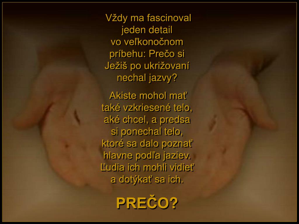 Vždy ma fascinoval jeden detail vo veľkonočnom príbehu: Prečo si Ježiš po ukrižovaní nechal jazvy? Akiste mohol mať také vzkriesené telo, aké chcel, a predsa si ponechal telo, ktoré sa dalo poznať hlavne podľa jaziev. Ľudia ich mohli vidieť a dotýkať sa ich. PREČO?