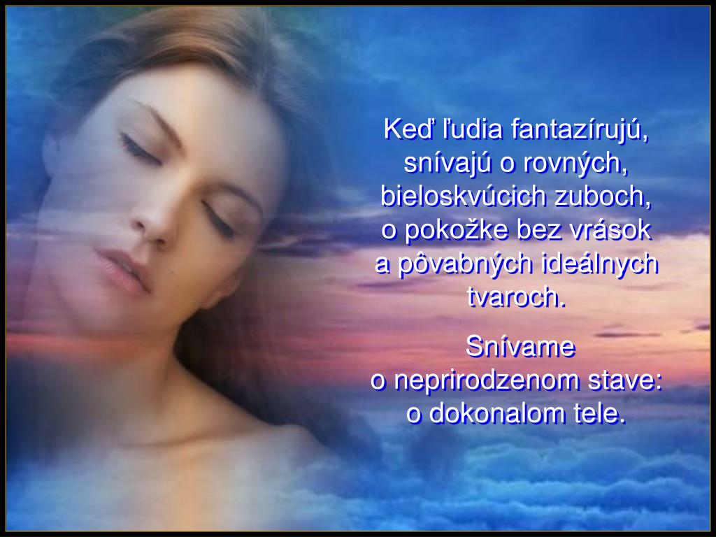 Keď ľudia fantazírujú,snívajú o rovných, bieloskvúcich zuboch,o pokožke bez vrásoka pôvabných ideálnych tvaroch. Snívame o neprirodzenom stave: o dokonalom tele.