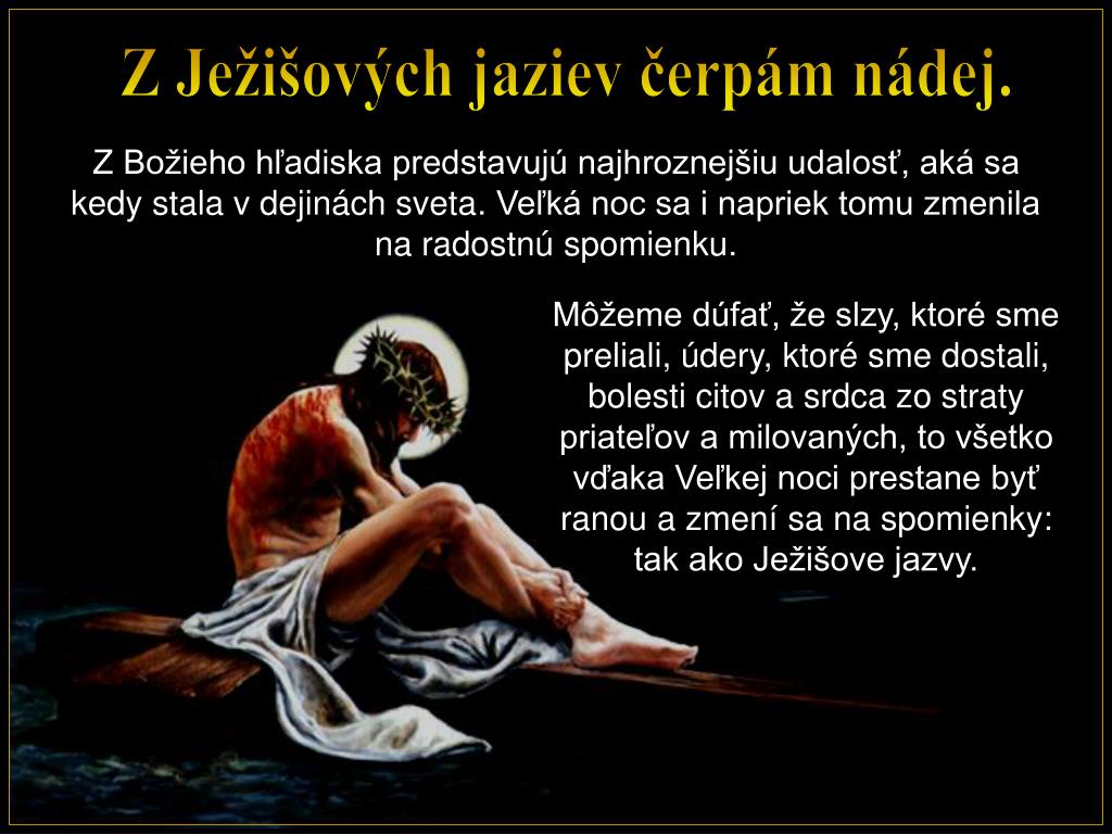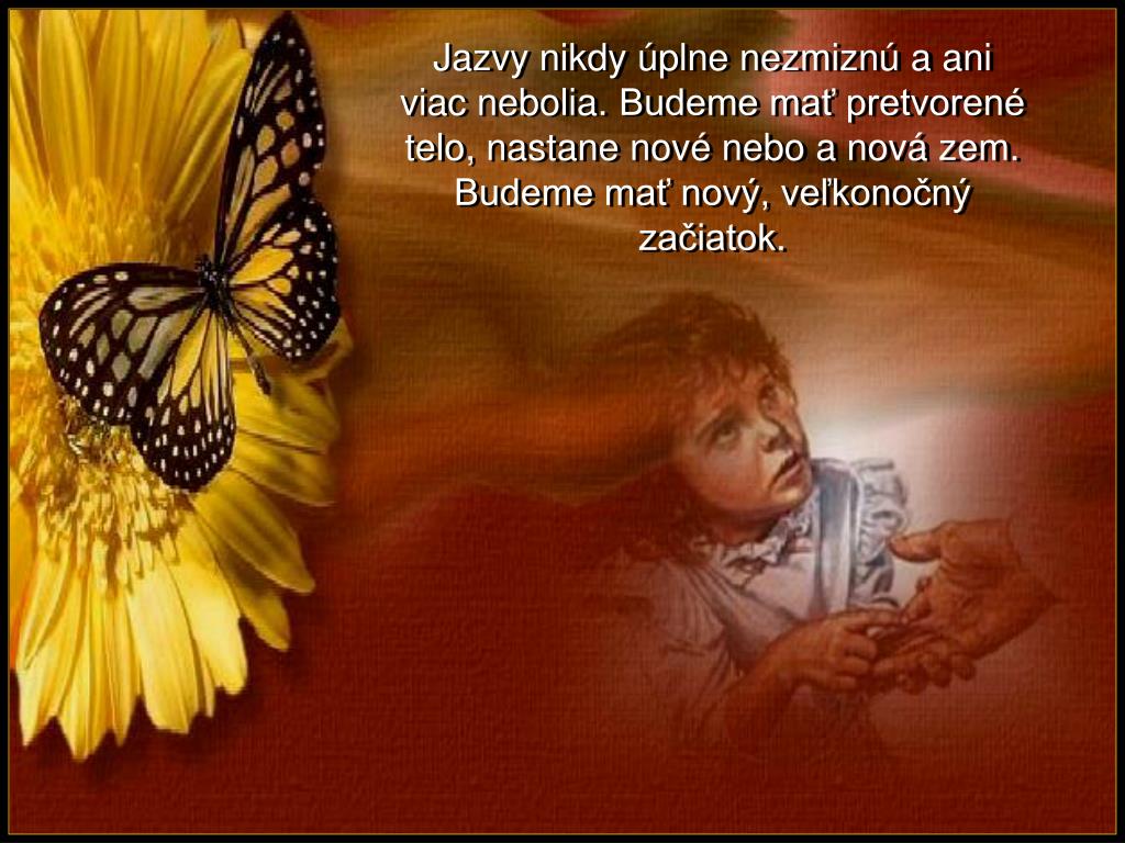 Jazvy nikdy úplne nezmiznú a ani viac nebolia. Budeme mať pretvorené telo, nastane nové nebo a nová zem.Budeme mať nový, veľkonočný začiatok.