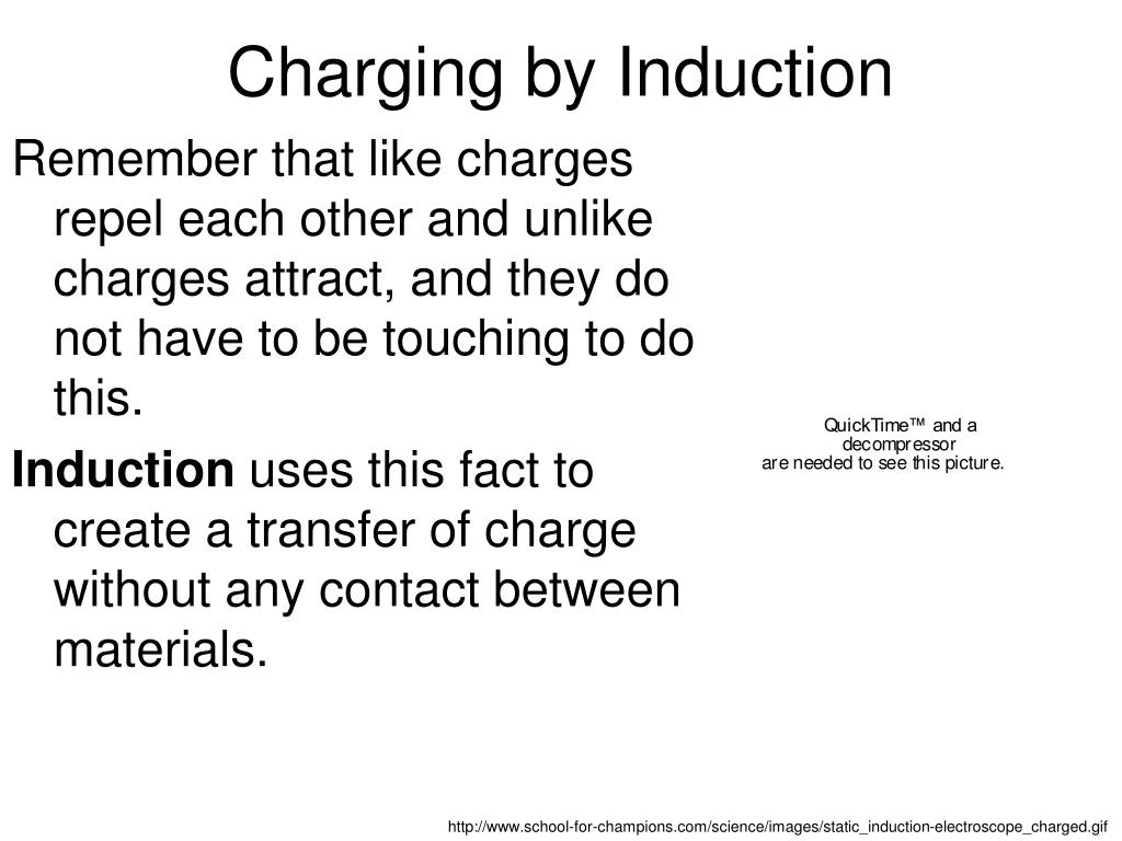 Charging by Induction Remember that like charges repel each other and unlike charges attract, and they do not have to be touching to do this. Induction uses this fact to create a transfer of charge without any contact between materials. http://www.school-for-champions.com/science/images/static_induction-electroscope_charged.gif