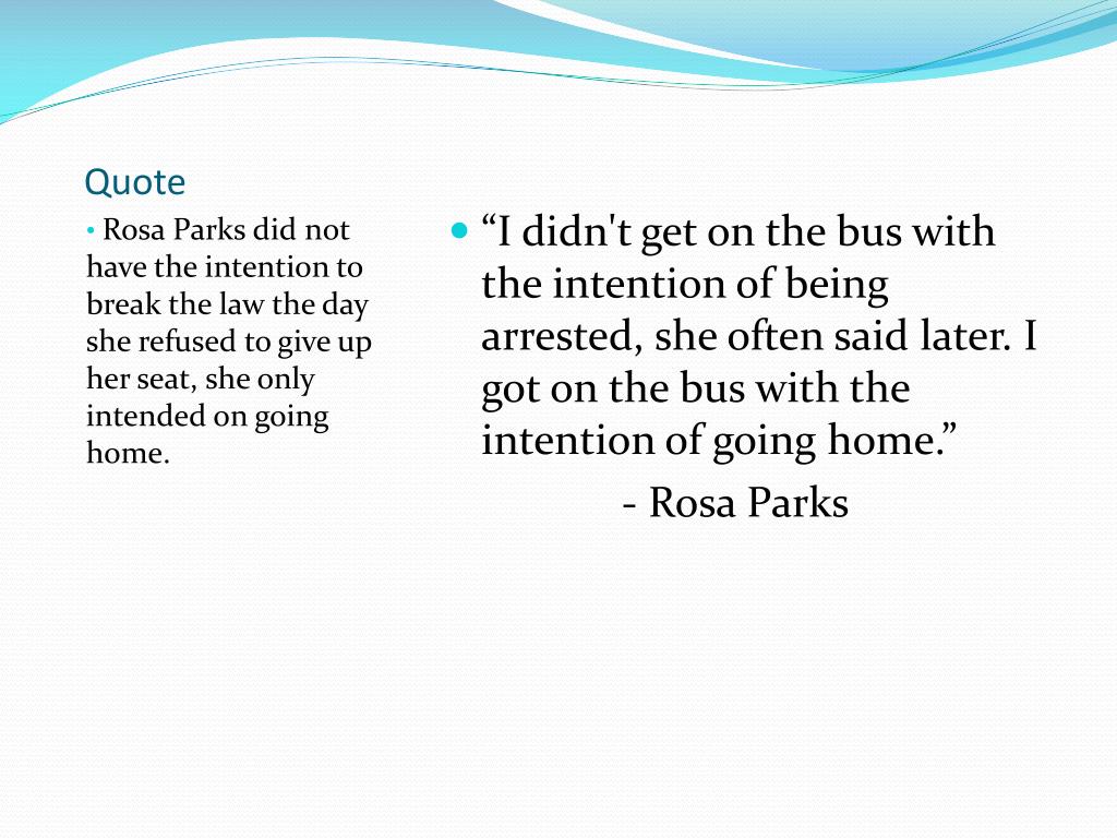 Quote Rosa Parks did not have the intention to break the law the day she refused to give up her seat, she only intended on going home. • “I didn't get on the bus with the intention of being arrested, she often said later. I got on the bus with the intention of going home.” - Rosa Parks