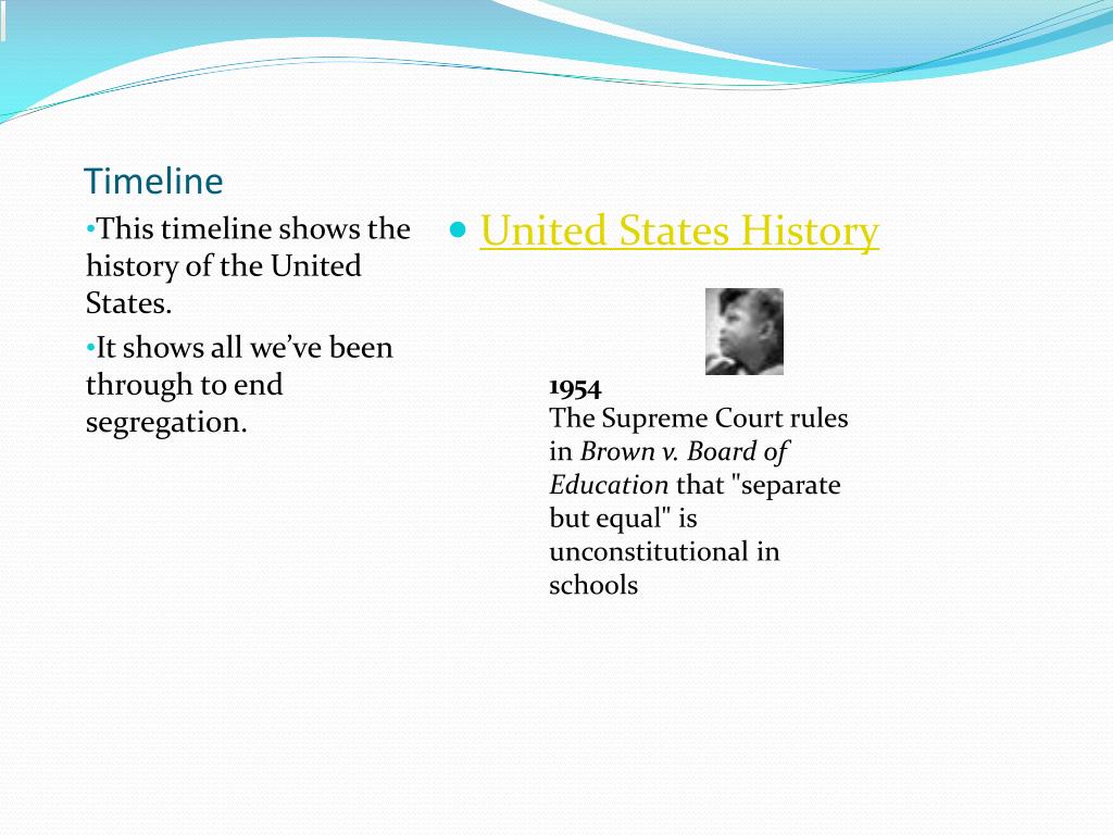 Timeline This timeline shows the history of the United States. It shows all we’ve been through to end segregation. • United States History 1954The Supreme Court rules in Brown v. Board of Education that "separate but equal" is unconstitutional in schools