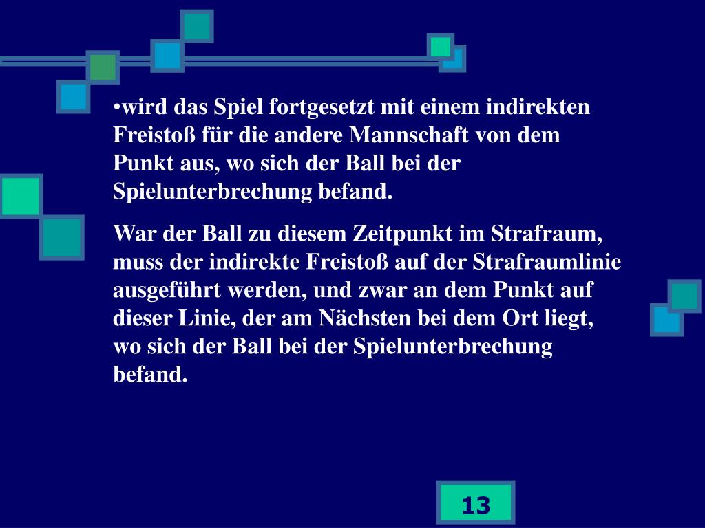 wird das Spiel fortgesetzt mit einem indirekten Freistoß für die andere Mannschaft von dem Punkt aus, wo sich der Ball bei der Spielunterbrechung befand. • War der Ball zu diesem Zeitpunkt im Strafraum, muss der indirekte Freistoß auf der Strafraumlinie ausgeführt werden, und zwar an dem Punkt auf dieser Linie, der am Nächsten bei dem Ort liegt, wo sich der Ball bei der Spielunterbrechung befand.