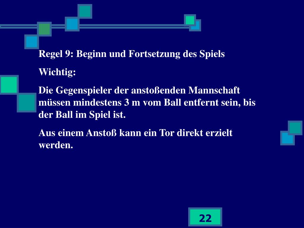 Regel 9: Beginn und Fortsetzung des Spiels Wichtig: Die Gegenspieler der anstoßenden Mannschaft müssen mindestens 3 m vom Ball entfernt sein, bis der Ball im Spiel ist. Aus einem Anstoß kann ein Tor direkt erzielt werden.