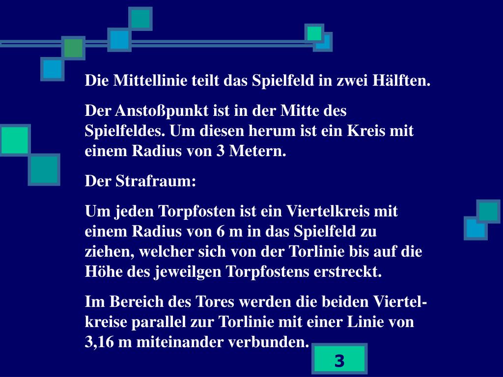 Regel 1: Das Spielfeld • Die Ausmaße: • Länge 25-42 Meter • Breite 15-25 Meter • Länderspiele: • 38 bis 42 Meter sowie 18 bis 22 Meter • Die Linien gehören zu den Räumen, die sie begrenzen • Alle Linien sind 8 cm breit.