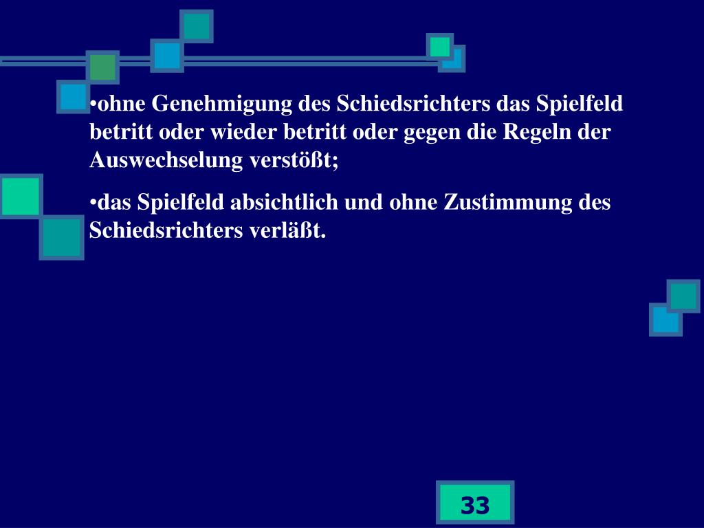 ohne Genehmigung des Schiedsrichters das Spielfeld betritt oder wieder betritt oder gegen die Regeln der Auswechselung verstößt; • das Spielfeld absichtlich und ohne Zustimmung des Schiedsrichters verläßt.