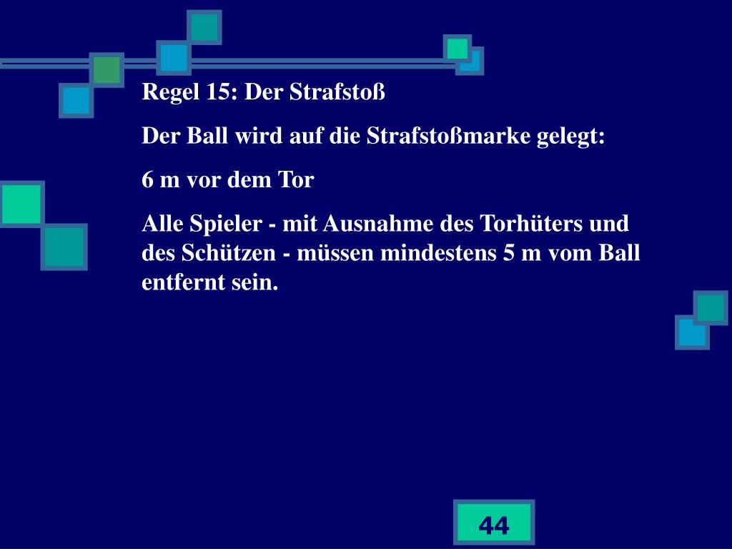 Regel 15: Der Strafstoß Der Ball wird auf die Strafstoßmarke gelegt: 6 m vor dem Tor Alle Spieler - mit Ausnahme des Torhüters und des Schützen - müssen mindestens 5 m vom Ball entfernt sein.