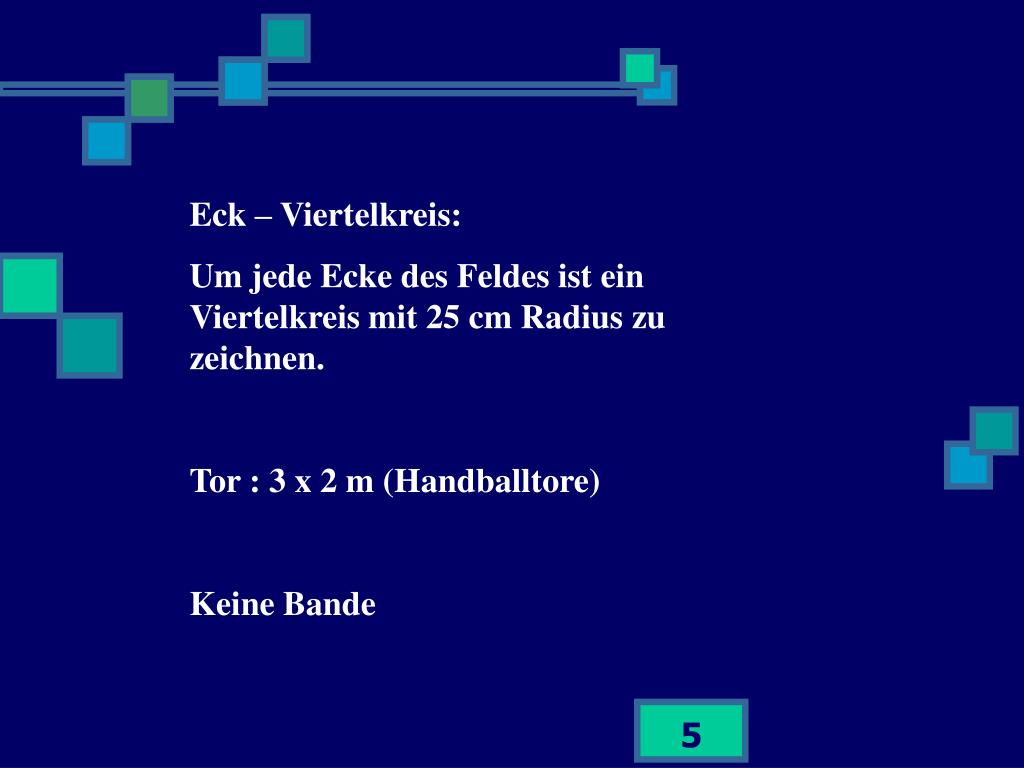 Eck – Viertelkreis: Um jede Ecke des Feldes ist ein Viertelkreis mit 25 cm Radius zu zeichnen. Tor : 3 x 2 m (Handballtore) Keine Bande