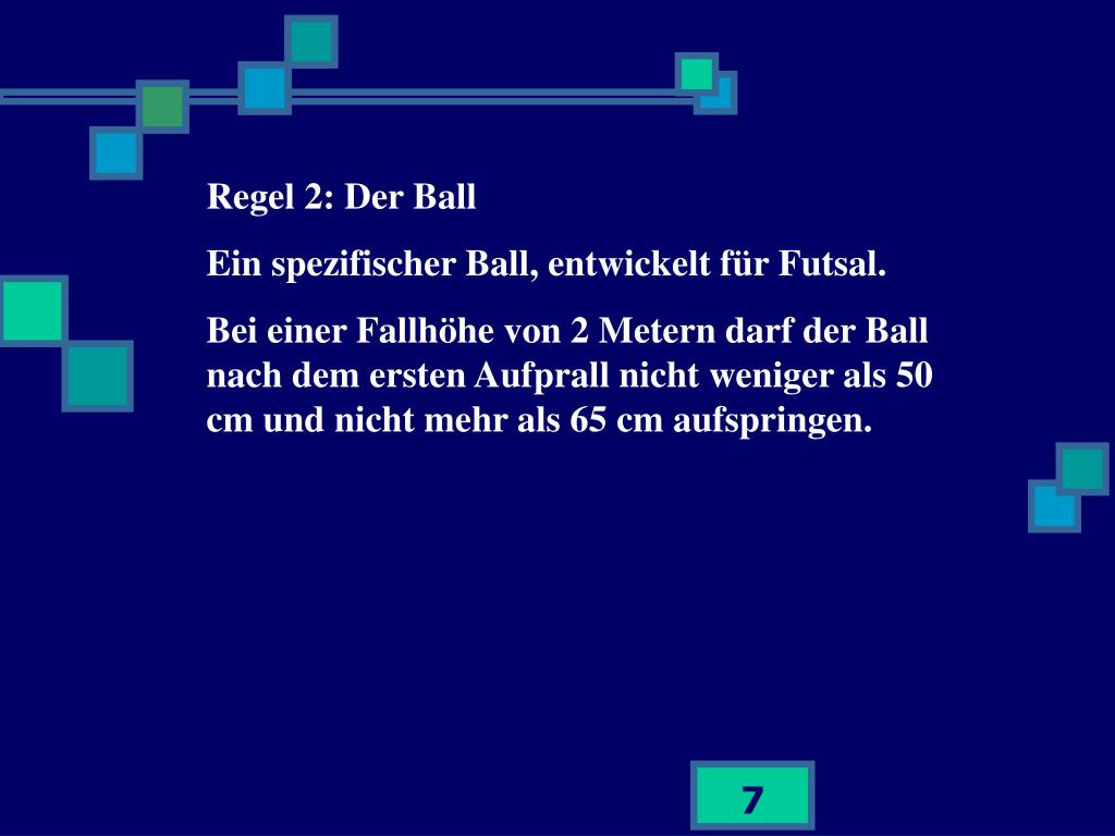 Regel 2: Der Ball Ein spezifischer Ball, entwickelt für Futsal. Bei einer Fallhöhe von 2 Metern darf der Ball nach dem ersten Aufprall nicht weniger als 50 cm und nicht mehr als 65 cm aufspringen.