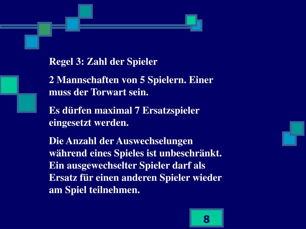 Regel 3: Zahl der Spieler 2 Mannschaften von 5 Spielern. Einer muss der Torwart sein. Es dürfen maximal 7 Ersatzspieler eingesetzt werden. Die Anzahl der Auswechselungen während eines Spieles ist unbeschränkt. Ein ausgewechselter Spieler darf als Ersatz für einen anderen Spieler wieder am Spiel teilnehmen.