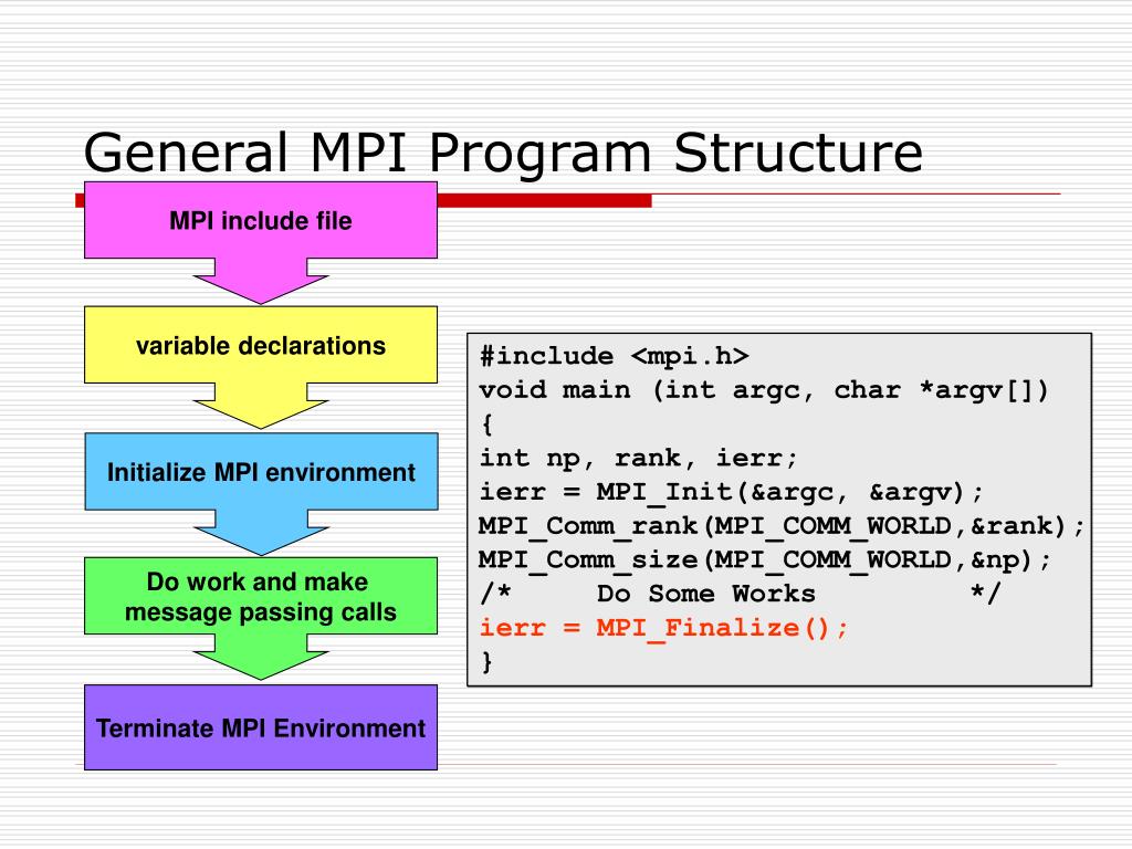 MPI include file #include <mpi.h> void main (int argc, char *argv[]) { int np, rank, ierr; ierr = MPI_Init(&argc, &argv); MPI_Comm_rank(MPI_COMM_WORLD,&rank); MPI_Comm_size(MPI_COMM_WORLD,&np); /* Do Some Works */ ierr = MPI_Finalize(); } #include <mpi.h> void main (int argc, char *argv[]) { int np, rank, ierr; ierr = MPI_Init(&argc, &argv); MPI_Comm_rank(MPI_COMM_WORLD,&rank); MPI_Comm_size(MPI_COMM_WORLD,&np); /* Do Some Works */ ierr = MPI_Finalize(); } #include <mpi.h> void main (int argc, char *argv[]) { int np, rank, ierr; ierr = MPI_Init(&argc, &argv); MPI_Comm_rank(MPI_COMM_WORLD,&rank); MPI_Comm_size(MPI_COMM_WORLD,&np); /* Do Some Works */ ierr = MPI_Finalize(); } variable declarations #include <mpi.h> void main (int argc, char *argv[]) { int np, rank, ierr; ierr = MPI_Init(&argc, &argv); MPI_Comm_rank(MPI_COMM_WORLD,&rank); MPI_Comm_size(MPI_COMM_WORLD,&np); /* Do Some Works */ ierr = MPI_Finalize(); } #include <mpi.h> void main (int argc, char *argv[]) { int np, rank, ierr; ierr = MPI_Init(&argc, &argv); MPI_Comm_rank(MPI_COMM_WORLD,&rank); MPI_Comm_size(MPI_COMM_WORLD,&np); /* Do Some Works */ ierr = MPI_Finalize(); } Initialize MPI environment Do work and make message passing calls Terminate MPI Environment General MPI Program Structure