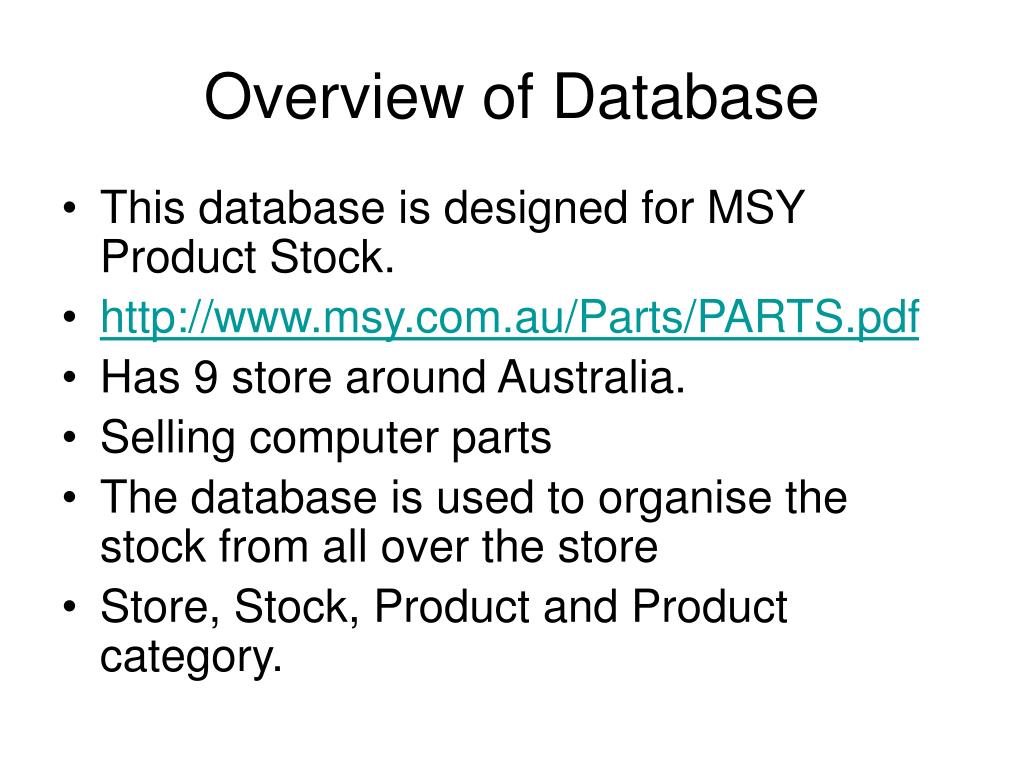THE DATABASE OF MSY TECHNOLOGY PTY. LTD PRODUCT Ronald Diningrat High Distinction Assignment Autumn 2007. Overview of Database. This database is designed for MSY Product Stock. http://www.msy.com.au/Parts/PARTS.pdf Has 9 store around Australia. Selling computer parts