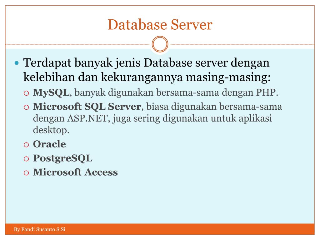 Database Server • Terdapat banyak jenis Database server dengan kelebihan dan kekurangannya masing-masing: • MySQL, banyak digunakan bersama-sama dengan PHP. • Microsoft SQL Server, biasa digunakan bersama-sama dengan ASP.NET, juga sering digunakan untuk aplikasi desktop. • Oracle • PostgreSQL • Microsoft Access By Fandi Susanto S.Si