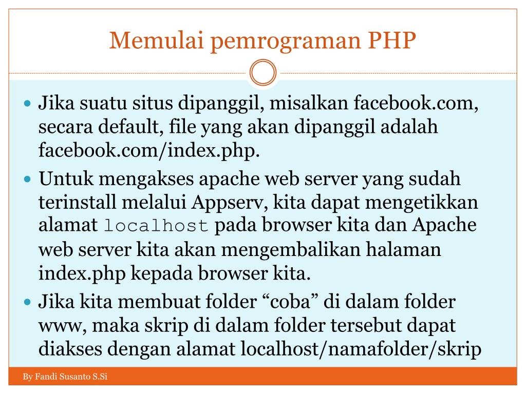 Memulai pemrograman PHP Jika suatu situs dipanggil, misalkan facebook.com, secara default, file yang akan dipanggil adalah facebook.com/index.php. Untuk mengakses apache web server yang sudah terinstall melalui Appserv, kita dapat mengetikkan alamat localhost pada browser kita dan Apache web server kita akan mengembalikan halaman index.php kepada browser kita. Jika kita membuat folder “coba” di dalam folder www, maka skrip di dalam folder tersebut dapat diakses dengan alamat localhost/namafolder/skrip By Fandi Susanto S.Si