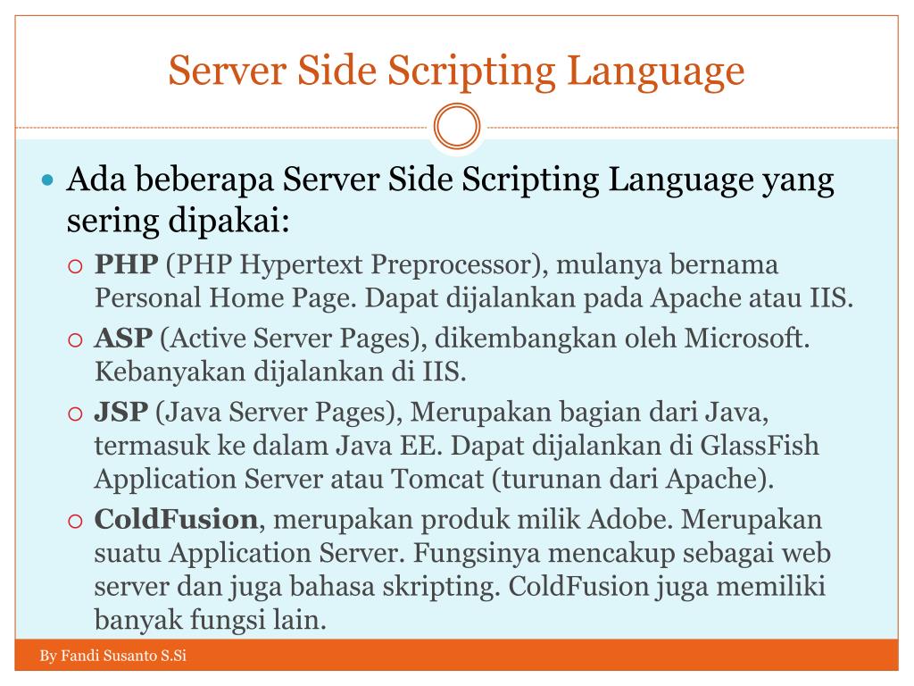 Server Side Scripting Language • Ada beberapa Server Side Scripting Language yang sering dipakai: • PHP (PHP Hypertext Preprocessor), mulanya bernama Personal Home Page. Dapat dijalankan pada Apache atau IIS. • ASP (Active Server Pages), dikembangkan oleh Microsoft. Kebanyakan dijalankan di IIS. • JSP (Java Server Pages), Merupakan bagian dari Java, termasuk ke dalam Java EE. Dapat dijalankan di GlassFish Application Server atau Tomcat (turunan dari Apache). • ColdFusion, merupakan produk milik Adobe. Merupakan suatu Application Server. Fungsinya mencakup sebagai web server dan juga bahasa skripting. ColdFusion juga memiliki banyak fungsi lain. By Fandi Susanto S.Si