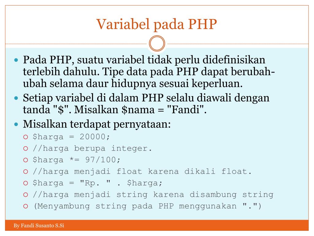 Variabel pada PHP • Pada PHP, suatu variabel tidak perlu didefinisikan terlebih dahulu. Tipe data pada PHP dapat berubah-ubah selama daur hidupnya sesuai keperluan. • Setiap variabel di dalam PHP selalu diawali dengan tanda "$". Misalkan $nama = "Fandi". • Misalkan terdapat pernyataan: • $harga = 20000; • //harga berupa integer. • $harga *= 97/100; • //harga menjadi float karena dikali float. • $harga = "Rp. " . $harga; • //harga menjadi string karena disambung string • (Menyambung string pada PHP menggunakan ".") By Fandi Susanto S.Si