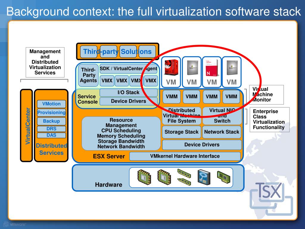Third-party Solutions Management and Distributed Virtualization Services VM VM VM VM VMotion Provisioning Backup DistributedVirtual Machine File System Virtual NIC andSwitch VirtualCenter Enterprise Class Virtualization Functionality DRS ResourceManagement CPU Scheduling Memory Scheduling Storage Bandwidth Network Bandwidth DAS Distributed Services Background context: the full virtualization software stack Third- Party Agents SDK / VirtualCenter Agent VMX VMX VMX VMX Virtual Machine Monitor I/O Stack VMM VMM VMM VMM Service Console Device Drivers Storage Stack Network Stack Device Drivers ESX Server VMkernel Hardware Interface Hardware