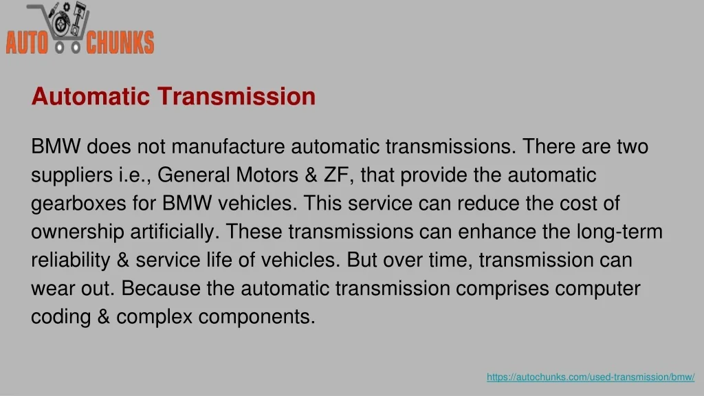 Automatic Transmission BMW does not manufacture automatic transmissions. There are two suppliers i.e., General Motors & ZF, that provide the automatic gearboxes for BMW vehicles. This service can reduce the cost of ownership artificially. These transmissions can enhance the long-term reliability & service life of vehicles. But over time, transmission can wear out. Because the automatic transmission comprises computer coding & complex components. https://autochunks.com/used-transmission/bmw/