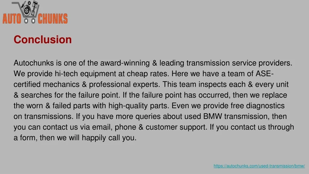 Conclusion Autochunks is one of the award-winning & leading transmission service providers. We provide hi-tech equipment at cheap rates. Here we have a team of ASE-certified mechanics & professional experts. This team inspects each & every unit & searches for the failure point. If the failure point has occurred, then we replace the worn & failed parts with high-quality parts. Even we provide free diagnostics on transmissions. If you have more queries about used BMW transmission, then you can contact us via email, phone & customer support. If you contact us through a form, then we will happily call you. https://autochunks.com/used-transmission/bmw/