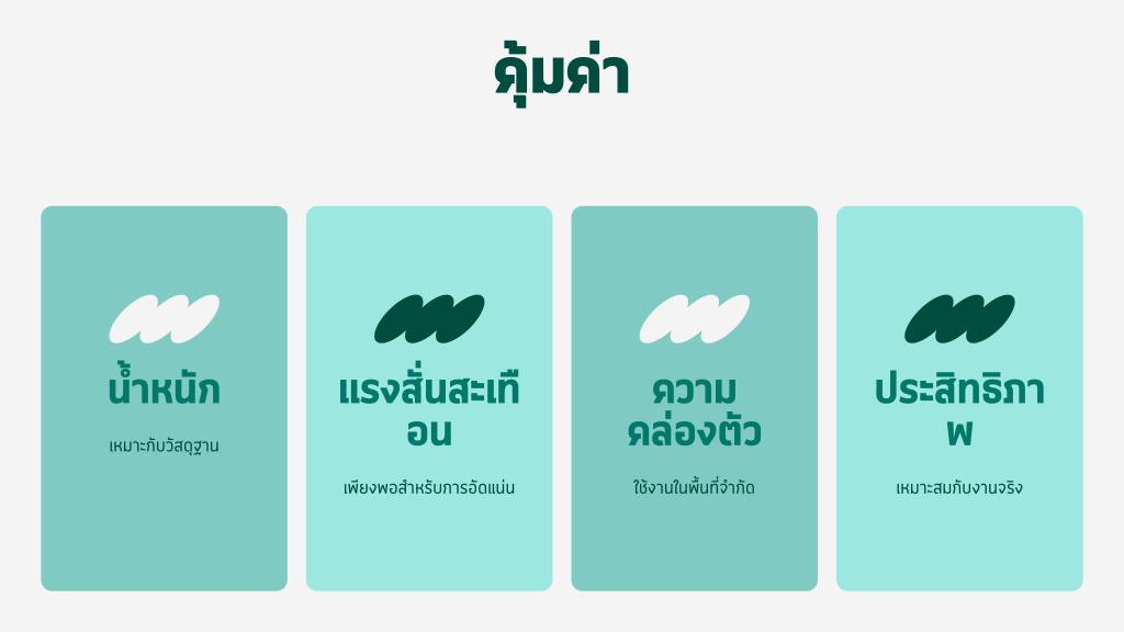 น้ำหนัก • แรงสั่นสะเทือน • ความคล่องตัว • ประสิทธิภาพ • คุ้มค่า • เหมาะกับวัสดุฐาน • เพียงพอสำหรับการอัดแน่น • ใช้งานในพื้นที่จำกัด • เหมาะสมกับงานจริง