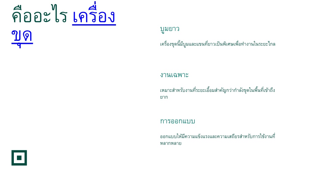 บูมยาว • งานเฉพาะ • การออกแบบ • คืออะไร เครื่องขุด • เครื่องขุดนี้มีบูมและแขนที่ยาวเป็นพิเศษเพื่อทำงานในระยะไกล • เหมาะสำหรับงานที่ระยะเอื้อมสำคัญกว่ากำลังขุดในพื้นที่เข้าถึงยาก • ออกแบบให้มีความแข็งแรงและความเสถียรสำหรับการใช้งานที่หลากหลาย