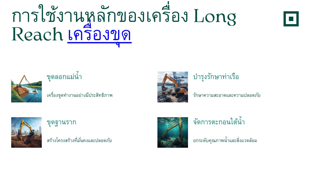 งานขุดลึก • ทำงานระยะไกล • คุณสมบัติพิเศษ • ทำไม Long Reach เครื่องขุด จึงสำคัญ • เครื่องนี้เหมาะสำหรับการขุดลึกในพื้นที่ยากต่อการเข้าถึง • ถูกออกแบบมาเพื่อลดความเสี่ยงในการทำงานในระยะไกล • มีความสามารถในการทำงานในพื้นที่น้ำหรือชายฝั่งได้อย่างมีประสิทธิภาพ