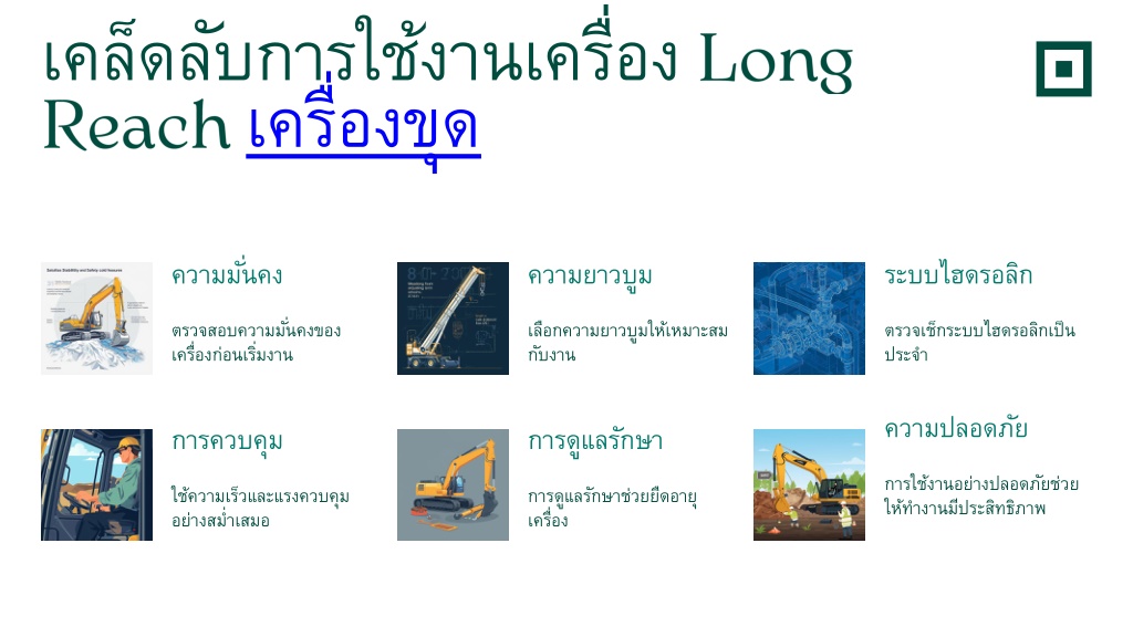 ความมั่นคง • ความยาวบูม • ระบบไฮดรอลิก • การควบคุม • การดูแลรักษา • ความปลอดภัย • เคล็ดลับการใช้งานเครื่อง Long Reach เครื่องขุด • ตรวจสอบความมั่นคงของเครื่องก่อนเริ่มงาน • เลือกความยาวบูมให้เหมาะสมกับงาน • ตรวจเช็กระบบไฮดรอลิกเป็นประจำ • ใช้ความเร็วและแรงควบคุมอย่างสม่ำเสมอ • การดูแลรักษาช่วยยืดอายุเครื่อง • การใช้งานอย่างปลอดภัยช่วยให้ทำงานมีประสิทธิภาพ