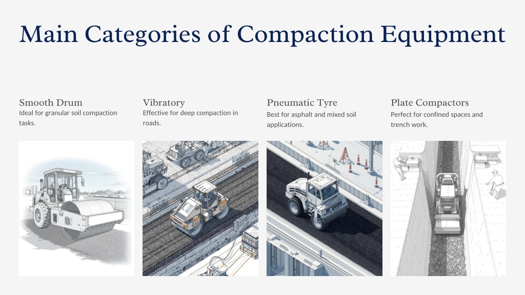 Smooth Drum • Pneumatic Tyre • Vibratory • Plate Compactors • Ideal for granular soil compaction tasks. • Effective for deep compaction in roads. • Best for asphalt and mixed soil applications. • Perfect for confined spaces and trench work. • Main Categories of Compaction Equipment