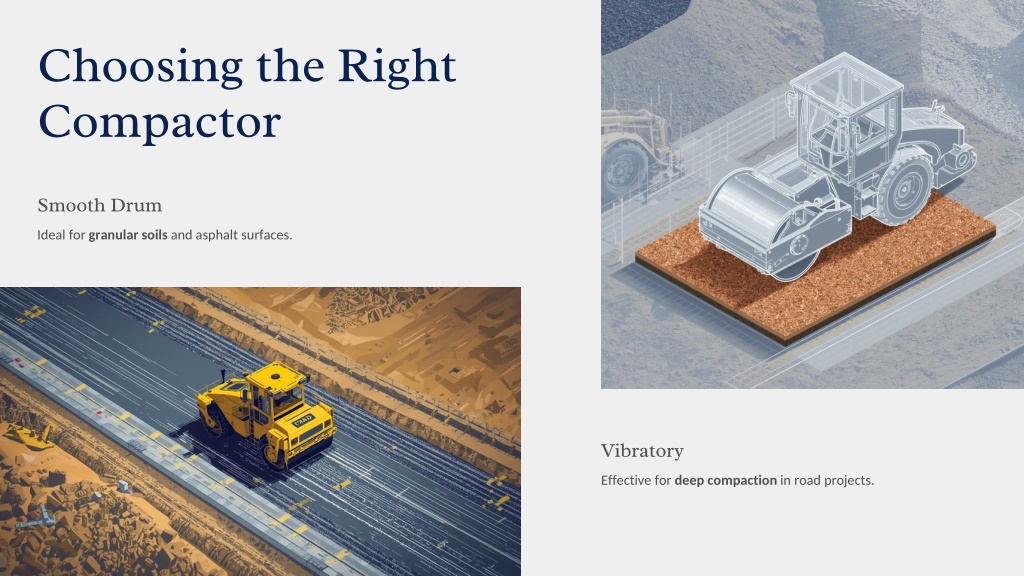Vibratory • Choosing the Right Compactor • Effective for deep compaction in road projects. • Smooth Drum • Ideal for granular soils and asphalt surfaces.