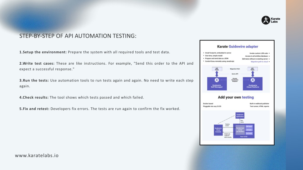 STEP-BY-STEP OF API AUTOMATION TESTING: 1.Setup the environment: Prepare the system with all required tools and test data. 2.Write test cases: These are like instructions. For example, "Send this order to the API and expect a successful response." 3.Run the tests: Use automation tools to run tests again and again. No need to write each step again. 4.Check results: The tool shows which tests passed and which failed. 5.Fix and retest: Developers fix errors. The tests are run again to confirm the fix worked. www.karatelabs.io