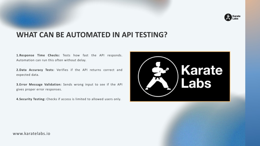 WHAT CAN BE AUTOMATED IN API TESTING? 1.Response Time Checks: Tests how fast the API responds. Automation can run this often without delay. 2.Data Accuracy Tests: Verifies if the API returns correct and expected data. 3.Error Message Validation: Sends wrong input to see if the API gives proper error responses. 4.Security Testing: Checks if access is limited to allowed users only. www.karatelabs.io