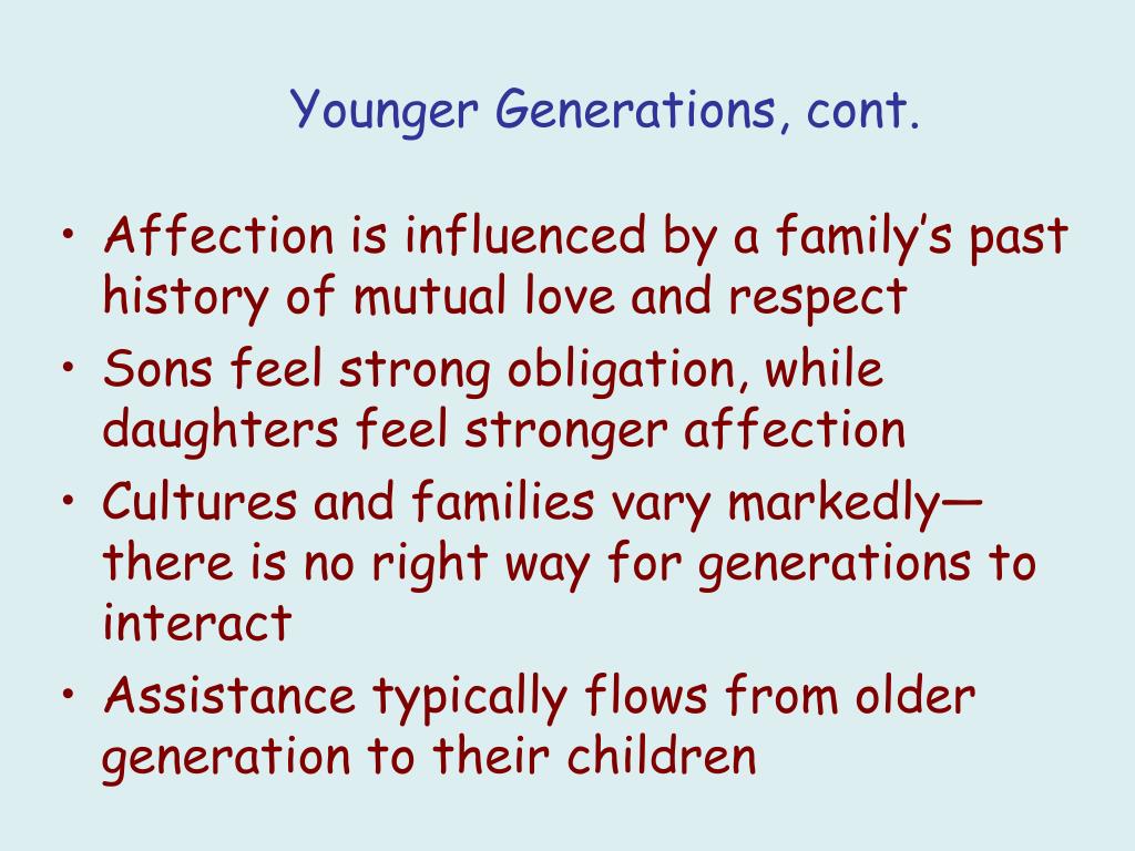Younger Generations, cont. • Affection is influenced by a family’s past history of mutual love and respect • Sons feel strong obligation, while daughters feel stronger affection • Cultures and families vary markedly—there is no right way for generations to interact • Assistance typically flows from older generation to their children