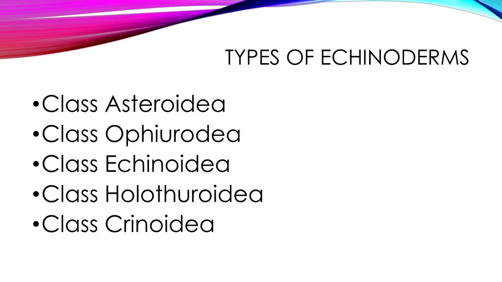 Types of Echinoderms • Class Asteroidea • Class Ophiurodea • Class Echinoidea • Class Holothuroidea • Class Crinoidea