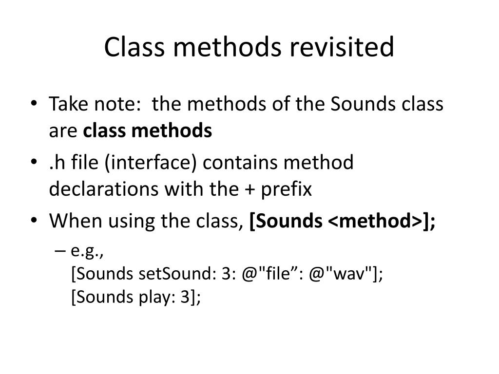 Class methods revisited • Take note: the methods of the Sounds class are class methods • .h file (interface) contains method declarations with the + prefix • When using the class, [Sounds <method>]; • e.g.,[Sounds setSound: 3: @"file”: @"wav"];[Sounds play: 3];